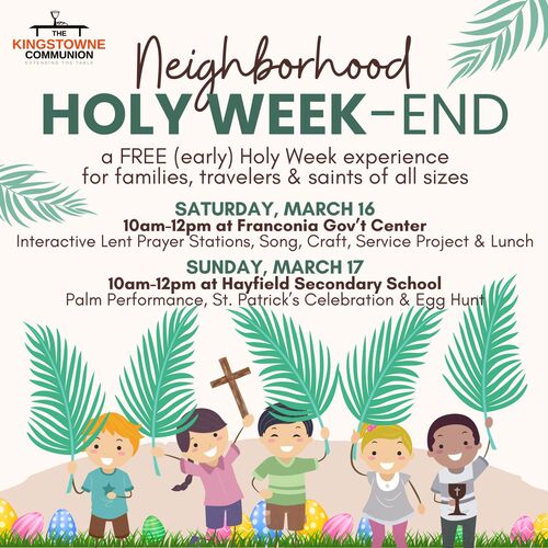 Join us for Palm Sunday with the Kingstowne Communion at Hayfield Secondary School (Door 9), beginning with our annual palm processional celebration of Jesus' triumphant entry into Jerusalem and concluding in solemn acknowledgement of and preparation for Christ's passion for us that goes all the way to the cross. Learn more and add to your calendar.