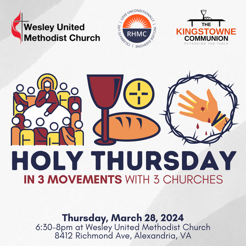 Join the Kingstowne Communion, Rising Hope Mission Church, and Wesley United Methodist Church (at Wesley UMC) for a collaborative, family-friendly Holy Thursday worship experience from 6:30-8pm, with dinner, song, message, and prayer, in three movements. Learn more and add to your calendar.