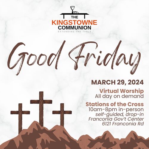 In addition to in-person Stations of the Cross, a virtual on-demand Good Friday worship service will be available on all Kingstowne Communion media platforms for online viewing anytime.